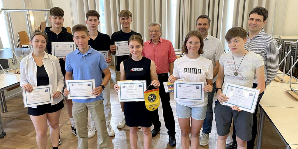 Im Rahmen der Bildungsinitiative „Lesenlernen mit dem Turbo-Team“ haben 8 Schülerinnen und Schüler des Gymnasiums Hohenbaden in ehrenamtlicher Tätigkeit als Tutor*innen Grundschüler beim Erwerb von Lesefähigkeiten unterstützt. Dafür wurden sie am Dienstag (23.07.2024) im Namen der Kiwanis Stiftung und des Projektes „TuLehr – wir rocken Lesen“ geehrt. Winfrid Mirau als Initiator und Vertreter der Kiwanis Stiftung überreichte entsprechende Urkunden. Die beiden anwesenden Schulleiter des Gymnasiums Hohenbaden, Martin Müller, sowie der Vincenti Grundschule, Alexander Ziola, händigten Büchergutscheine aus.